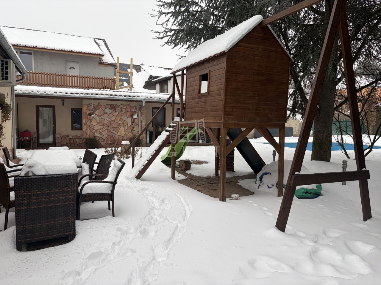 A gondozott nagy méretű kertben levő kerti búbos kemence, és a sütögető kiváló helyszíne a kikapcsolódásnak.