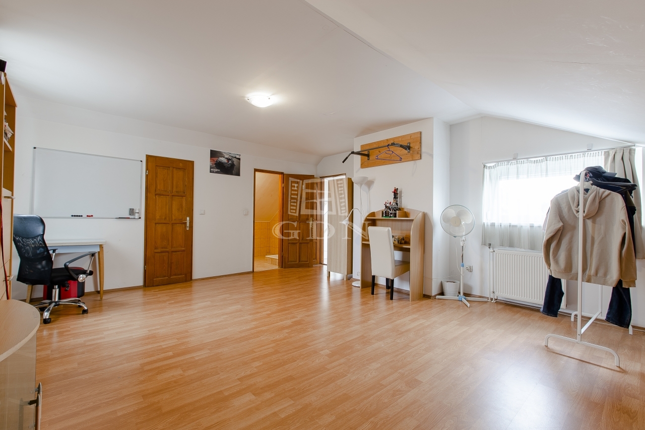 Szintén a közlekedőből jutunk fel a beépített teljes értékű tetőtérbe, ahol ki lett alakítva 2 db külön nyíló szoba, gardrób helyiség és egy zuhanyzós fürdőszoba. A nagyszoba további lehetőségeket rejt magába, szinte bárhogy lehet alakítani, akár 2 db szobává is.