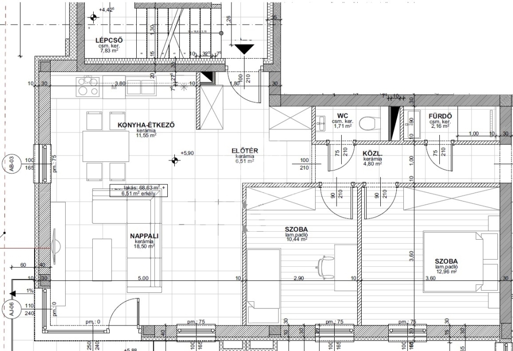 A lakás 69 nm nagyságú, nappali + 2 hálószoba elosztású, erkélye 7 nm nagyságú. A zuhanyzós fürdő és a wc külön helységben található.