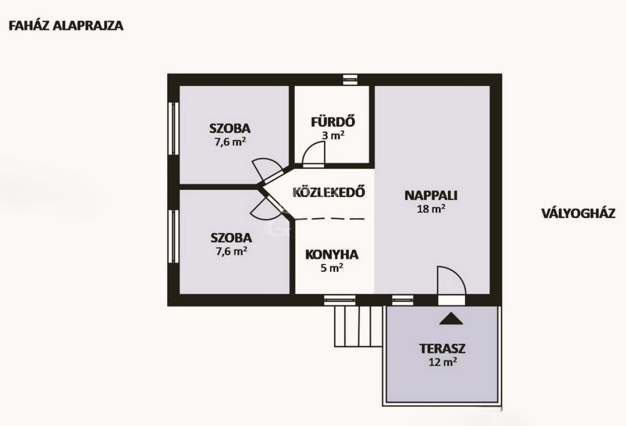 A teraszról tudunk belépni a 33 nm-es ingatlanba, melynek beton aljzat a megerősítése. Először az előtérbe jutunk. Jobbra a WC-vel is ellátott fürdőszobát találjuk, majd tovább haladva a konyhába léphetünk. A konyhából tudunk a délnyugati tájolású szobába bemenni, melynek ablaka a faház teraszára néz.