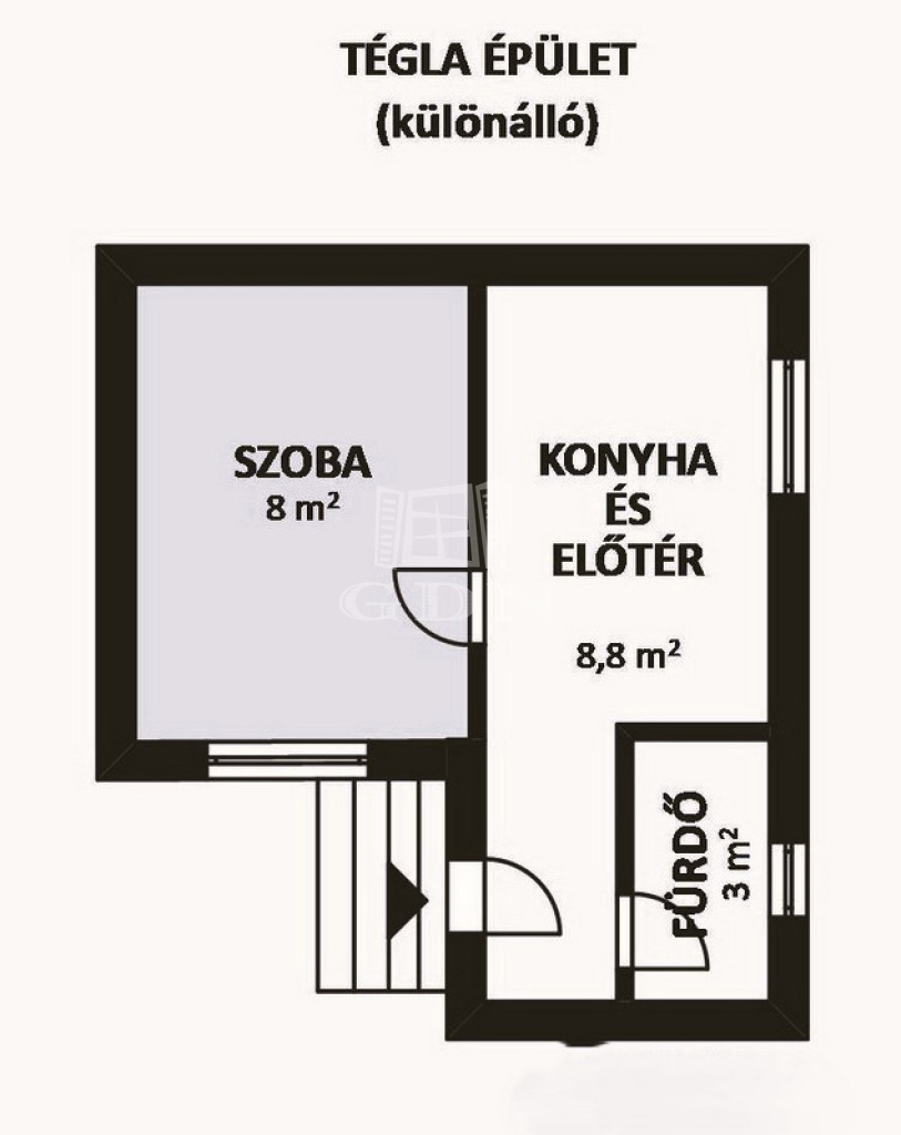 A főépület mellett található, egy teljesen különálló, közepes állapotú 20 nm-es tégla építésű ház. Helyiségei: Előszoba, 1 szoba, fürdőszoba WC-vel és konyha. A szobában hatalmas 60 cm mélységű gardróbszekrény található. A konyhabútor méretre csináltatott.