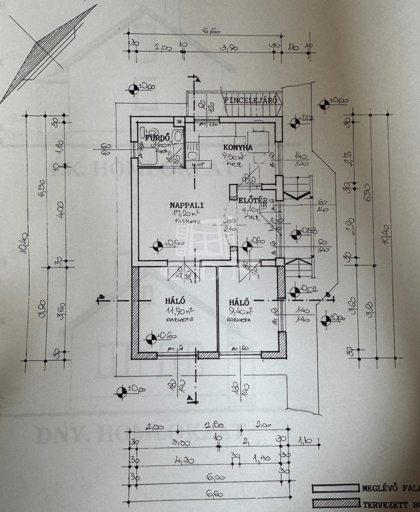 nappali 17,2m2, konyha-étkező 9,5m2, előtér 4,1m2, szoba 11,9m2, szoba9,4m2, fürdőszoba-wc 3,6m2;