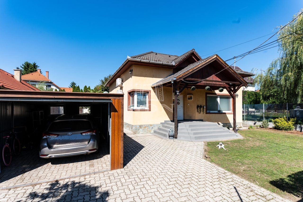 Az előkertben található egy zárt, könnyűszerkezetes GARÁZS, melyben kényelmesen elfér egy nagy autó és még bőven marad hely tárolásra is. További két autóval a telek előtt lehet parkolni.