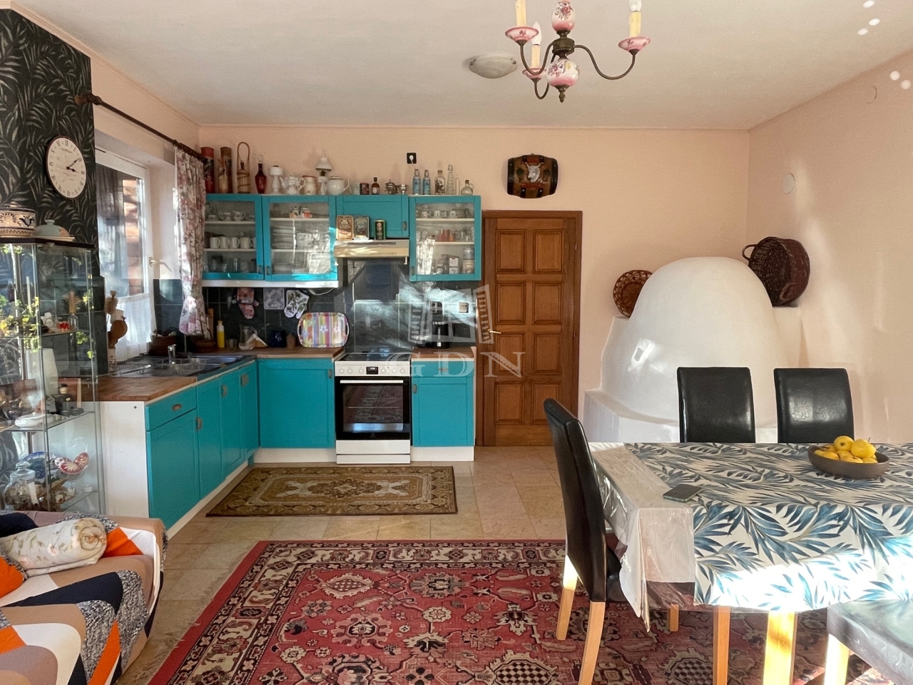 Az alsó szinten egy tágas, amerikai konyhás nappali fogad, ahol a búboskemence nemcsak hangulatos dísz, de akár a fűtést is biztosíthatja.