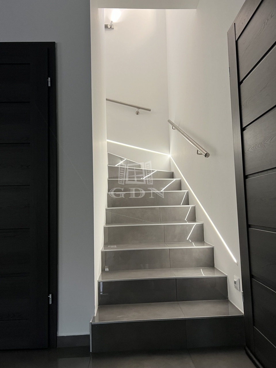 Az épület elrendezése átgondolt és élhető, a földszinten csak a garázsnál érintkezik a szomszéddal, az emeleten pedig mindössze két hálószobánál van a kapcsolódási pont.