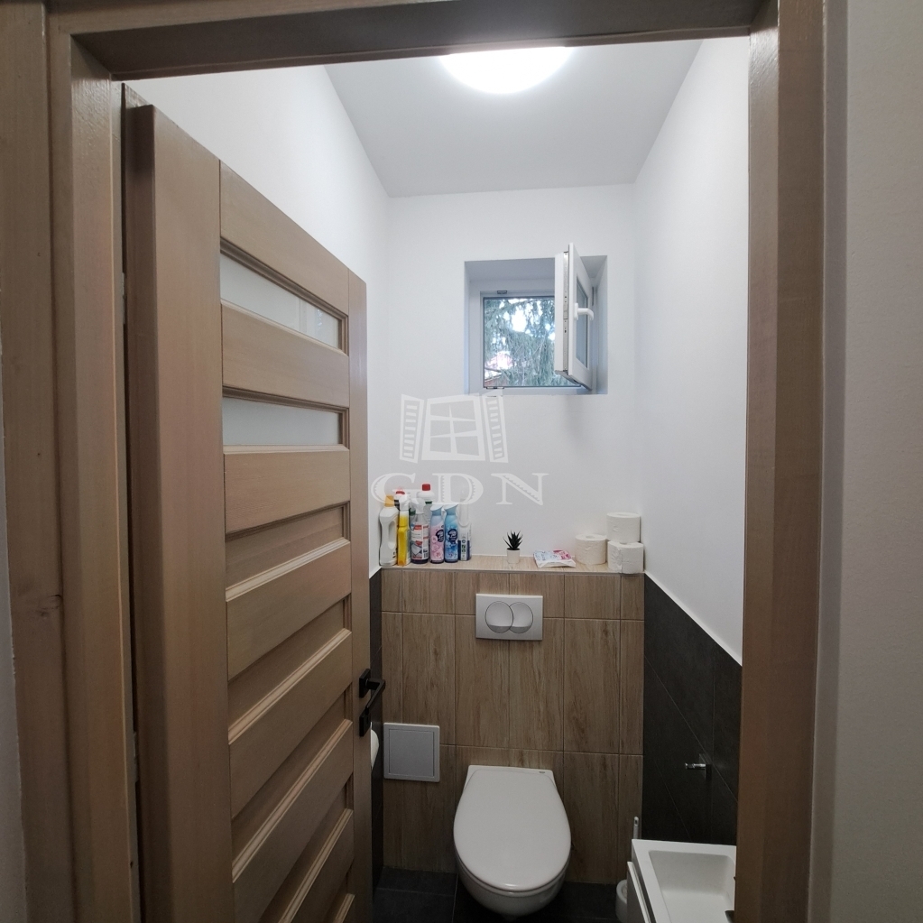 - A lépcsős, fedett bejáratról a tágas nappali-étkezőbe jutunk. Innen nyílik a 2 szoba, a konyha, a fürdőszoba és a WC.