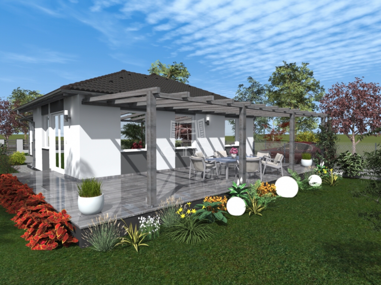 A ház belső elosztását igény szerint ön tervezheti meg a kivitelező tervezőjével. A hirdetésben szereplő alaprajz bővíthető, az ingatlan megépíttethető akár 140nm, 150nm alapterületűre.