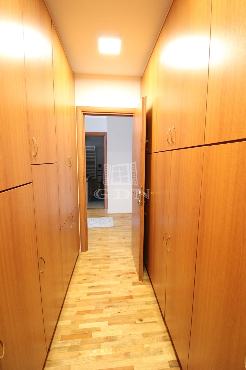 A felső szintre egy kényelmes fokkiosztású lépcsőn juthatunk fel, ahol is a br. 14nm terjedelmű világos előszoba (itt akár külön dolgozó vagy közösségi tér is kialakítható) valamint a 6nm-es kádas duplamosdós fürdő, kettő egyenként br.15,6 és 14nm terjedelmű hálószoba és egy közel 5nm es gardrób került kialakításra.