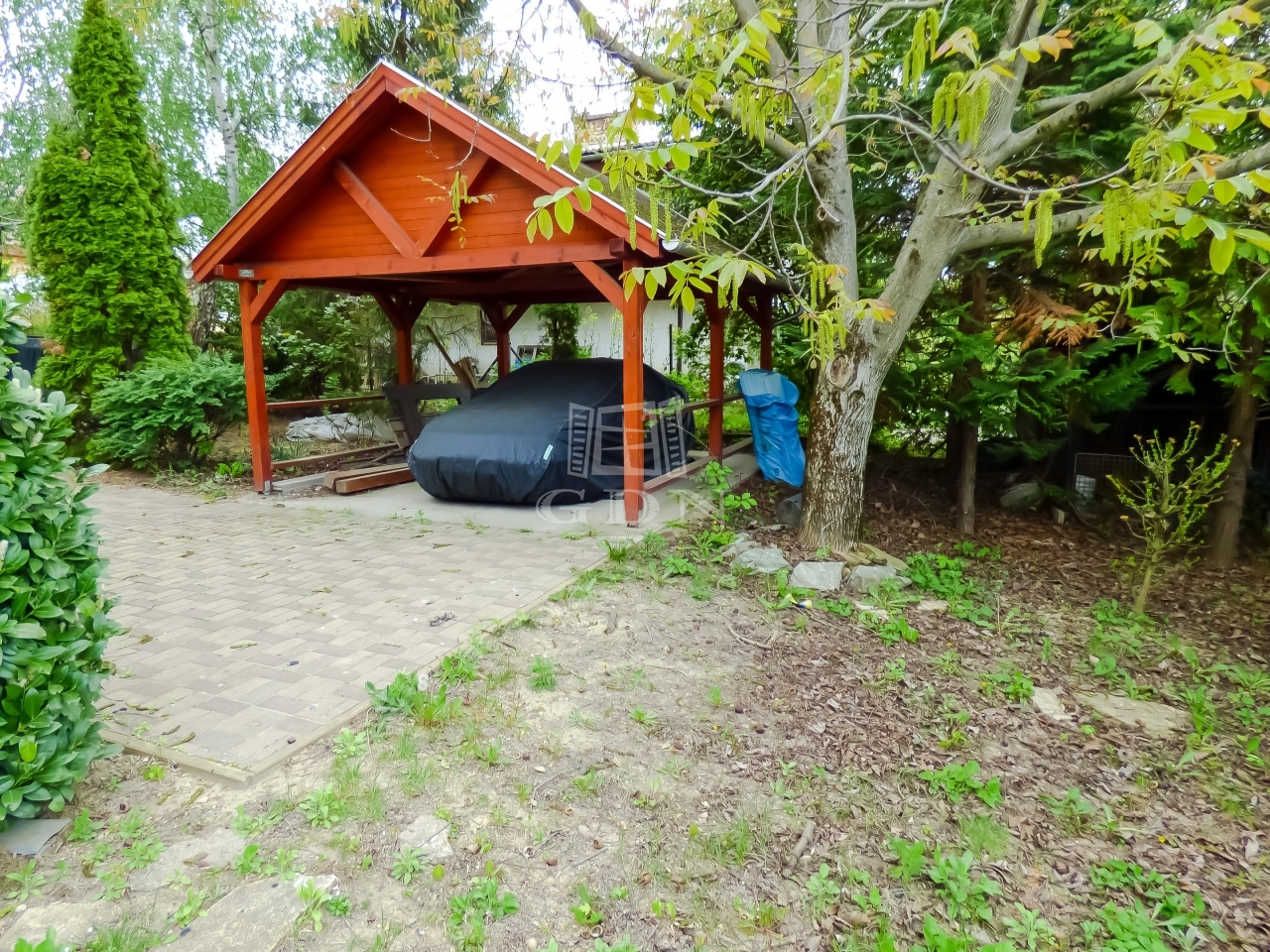 A fedett felszíni beálló és egy autó számára épült GARÁZS elektromos kapun keresztül közelíthető meg, viakolor borítású, továbbá a zárt udvaron belül cca. 4-5 autó is elfér.