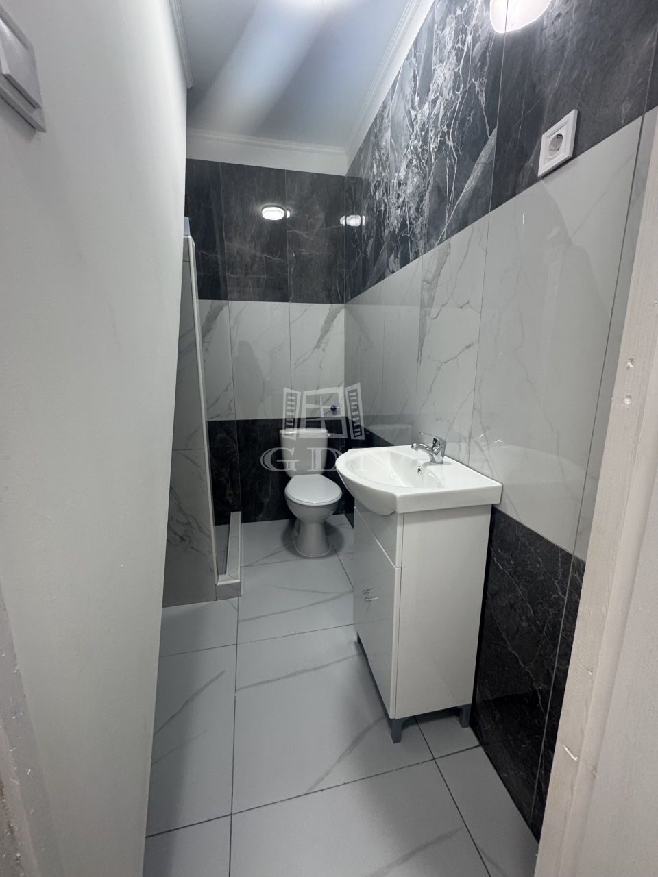 az alsó szinten egy külön nyíló szoba, egy tágas, amerikai konyhás nappali, valamint egy modern, zuhanyzós fürdőszoba került kialakításra.