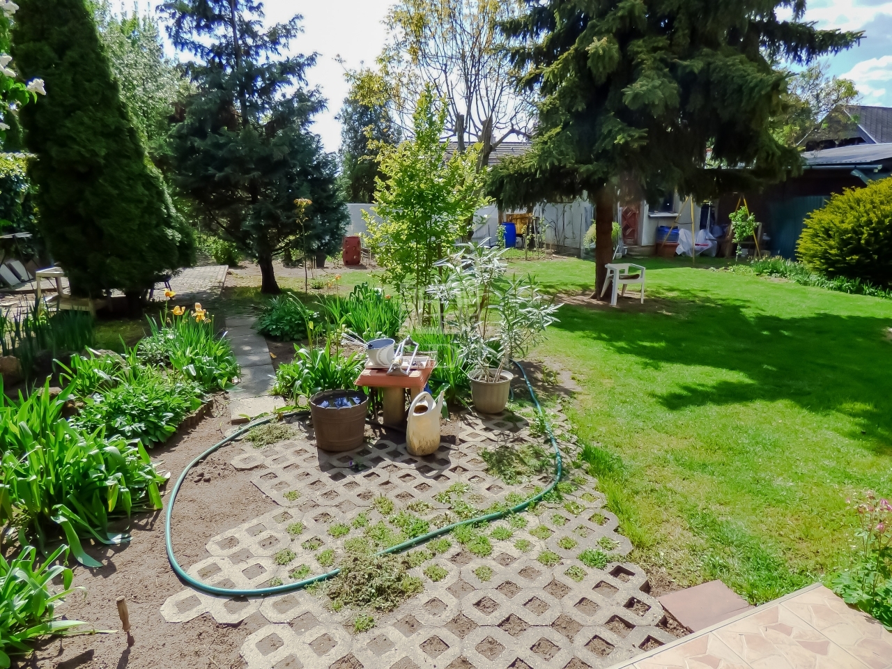 A kert gondozott, rendezett, kikapcsolódásra, pihenésre kiválóan alkalmas, az öntözés, esetlegesen egy medence feltöltése 38 m mély fúrt kútról megoldott.