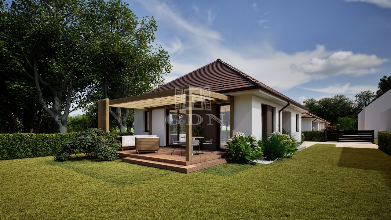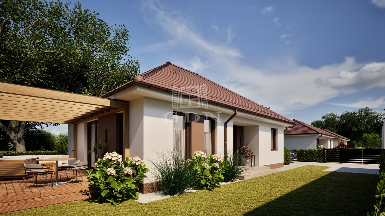 A Wienerberger Porotherm téglából épülő házak magas műszaki tartalommal épülnek. Tetőszerkezete C22 I. osztályú , rovar, gomba és lángmentesítővel kezelt faanyaggal kerül kivitelezésre. Fedése Terran vagy Bramac cseréppel történik, az összes rendszer tartozékkal, előírások szerint helyenként hófogóval. Bádogos szerkezetek, a külső vízelvezetések ereszcsatornái, a lefolyócsövei és az egyéb bádogos szerkezetek 0.6 mm vastag acéllemezből készülnek. Homlokzati falfelületek 15 cm vastag EPS hőszigetelő rendszert, a lábazatok 10 cm vastag XPS lábazati hőszigetelő rendszert kapnak. A padozatokba 10 cm vastag teherbíró EPS hab hőszigetelés kerül. A födém hőszigetelése 25 cm vastag ásványgyapot szigetelőanyaggal történik. Külső nyílászárói műanyag, három rétegű üvegezéssel szerelt, fokozottan hang-és hőszigeteltek. Fűtése, a háztartási helyiségben elhelyezett 10Kw teljesítményű Gree Versati 3 hőszivattyúval történik, padlófűtéses hőleadással szabályozható termosztáttal. A hőszivattyú biztosítja a melegvizet is, egy 200 literes hőtárolós víztartállyal. Nappaliában 3.5 Kw teljesítményű hűtő-fűtő klíma kerül. Az ingatlanban riasztó, kaputelefon, előkészítés történik. Beltéri ajtók, hideg-meleg burkolatok, szaniterek, csaptelepek választhatók.. Ha bővebb tájékoztatást szeretne, kérem keressen. Vegye igénybe irodánk szolgáltatásait. Hitelügyintézésben is segítünk.