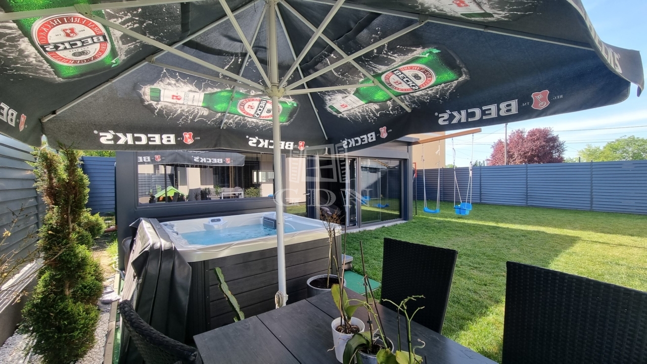 Energiahatékony ingatlan, saját 480m2 telekterület, kerti szaunaház, jakuzzi.