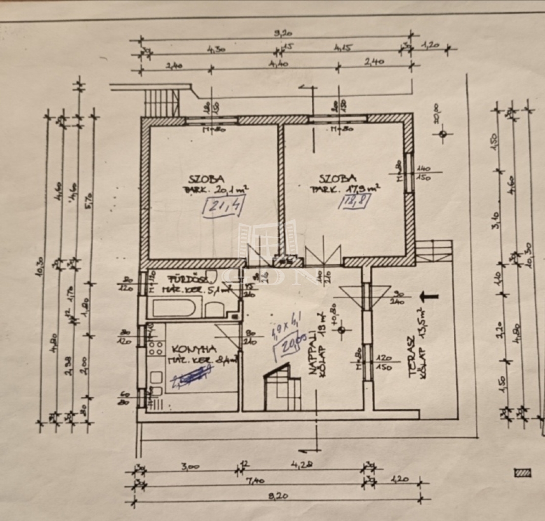 A ház belső struktúráját öt külön nyíló szoba alkotja, amelyek közül három nagyobb alapterületű, világos helyiségként szolgál, míg a további két szoba rugalmasan alakítható az igényekhez igazodva. Ez az elrendezés lehetőséget ad arra, hogy az ingatlan ne csak klasszikus családi otthonként, hanem akár dolgozószobával, vendégtérrel vagy többfunkciós élettérként is jól működjön. A különálló konyha, a két fürdőszoba és a gardrób rész a praktikumot erősítik, a 21 m²-es terasz és az erkély pedig a lakótér természetes kiterjesztéseként jelennek meg.