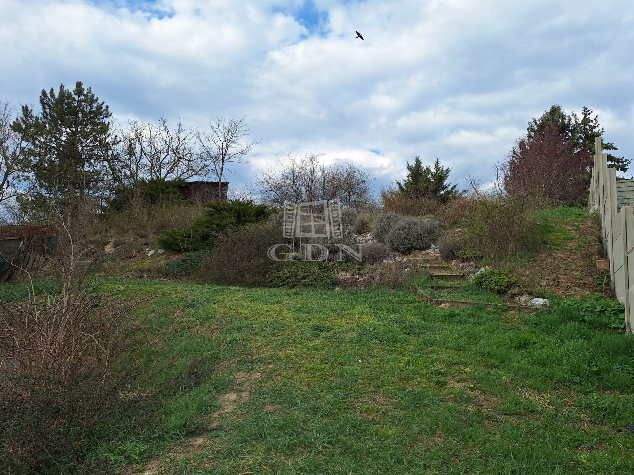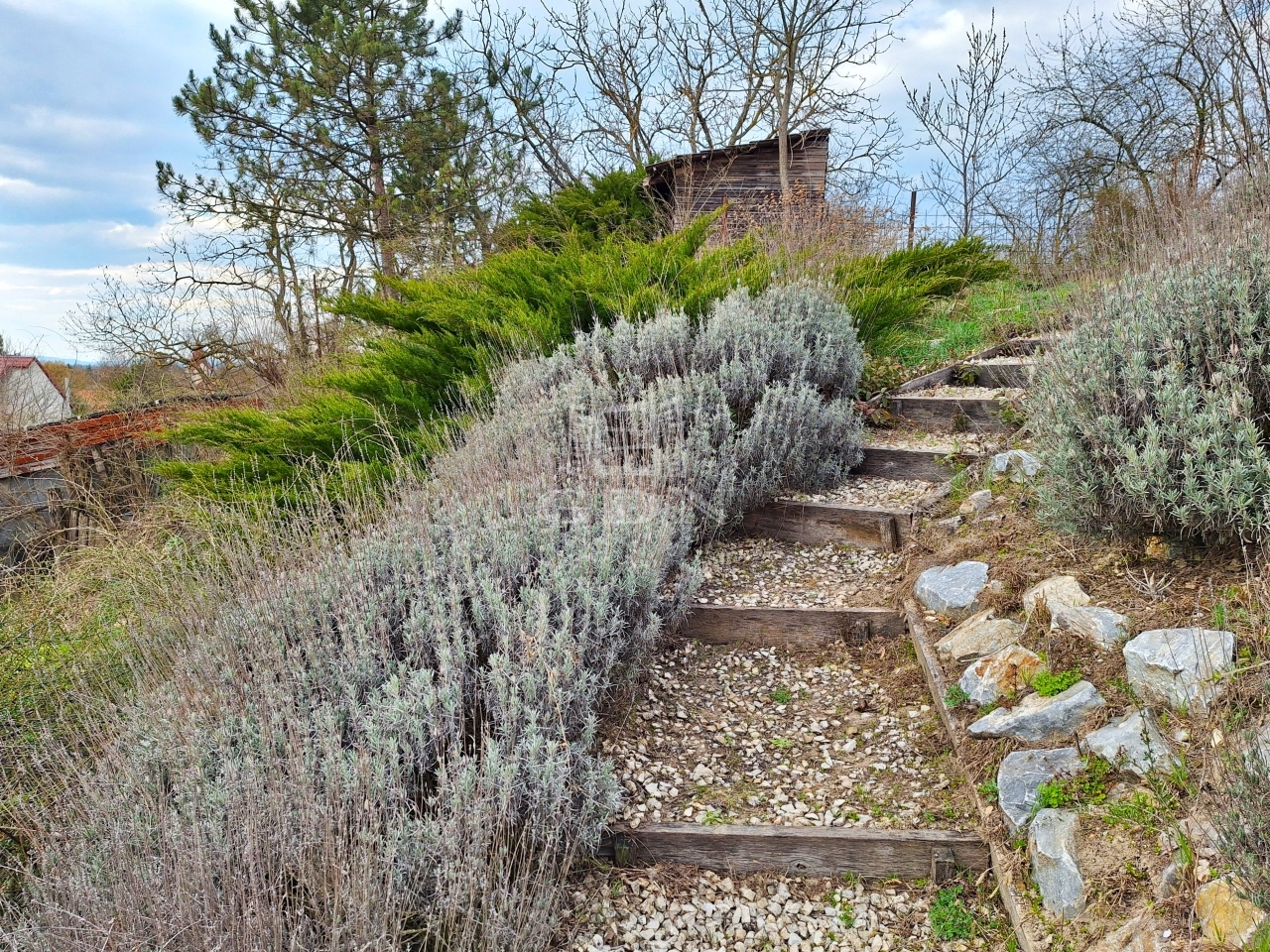 1000 m2 teraszos kialakítású, bekerített, szép növényekkel