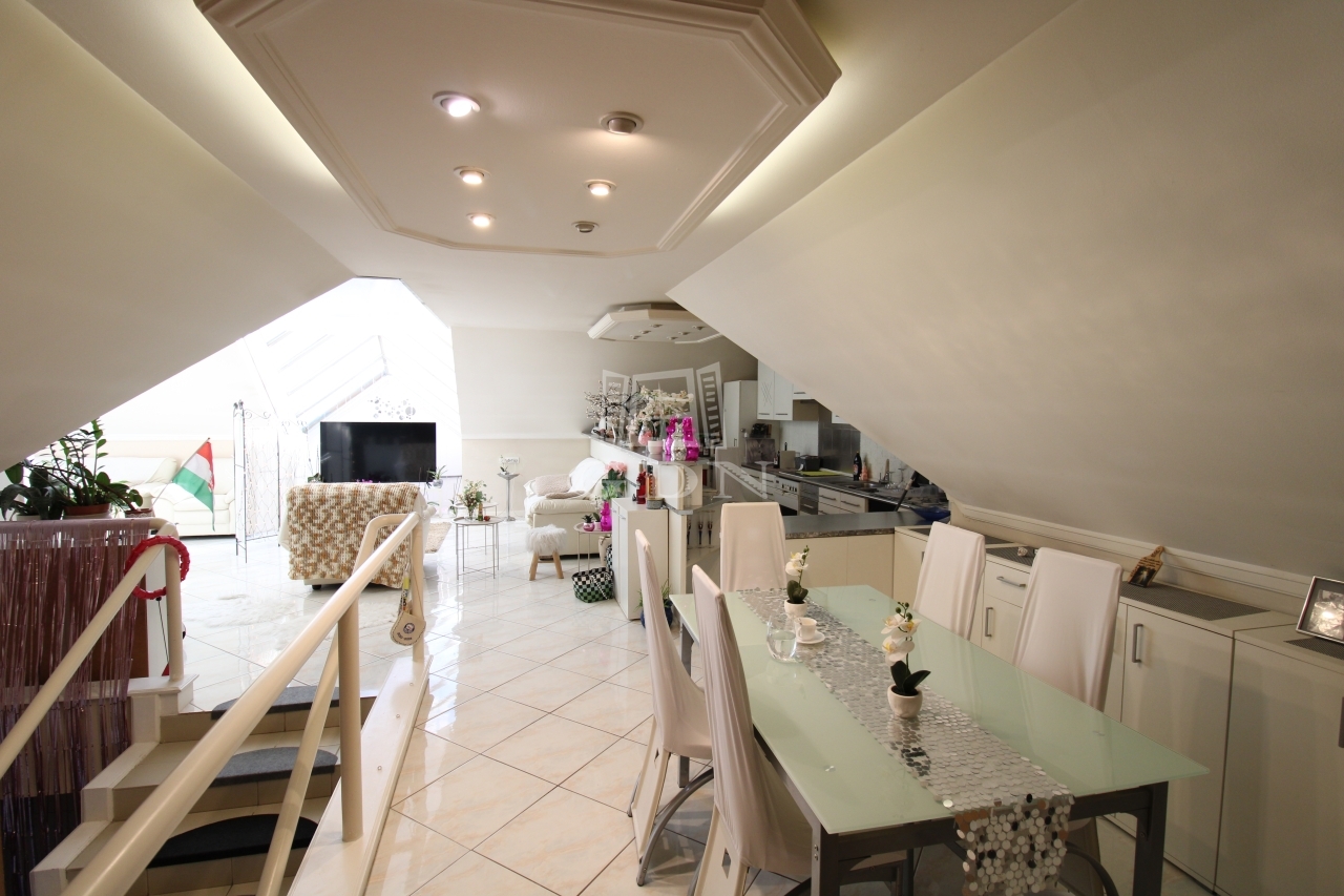 Felső szintre kényelmes fokkiosztású stabil lépcsőn juthatunk fel ahol is kettő félszoba, tágas világos fürdőszoba, illemhely és egy hatalmas amerikai konyhás nappali kapott helyet