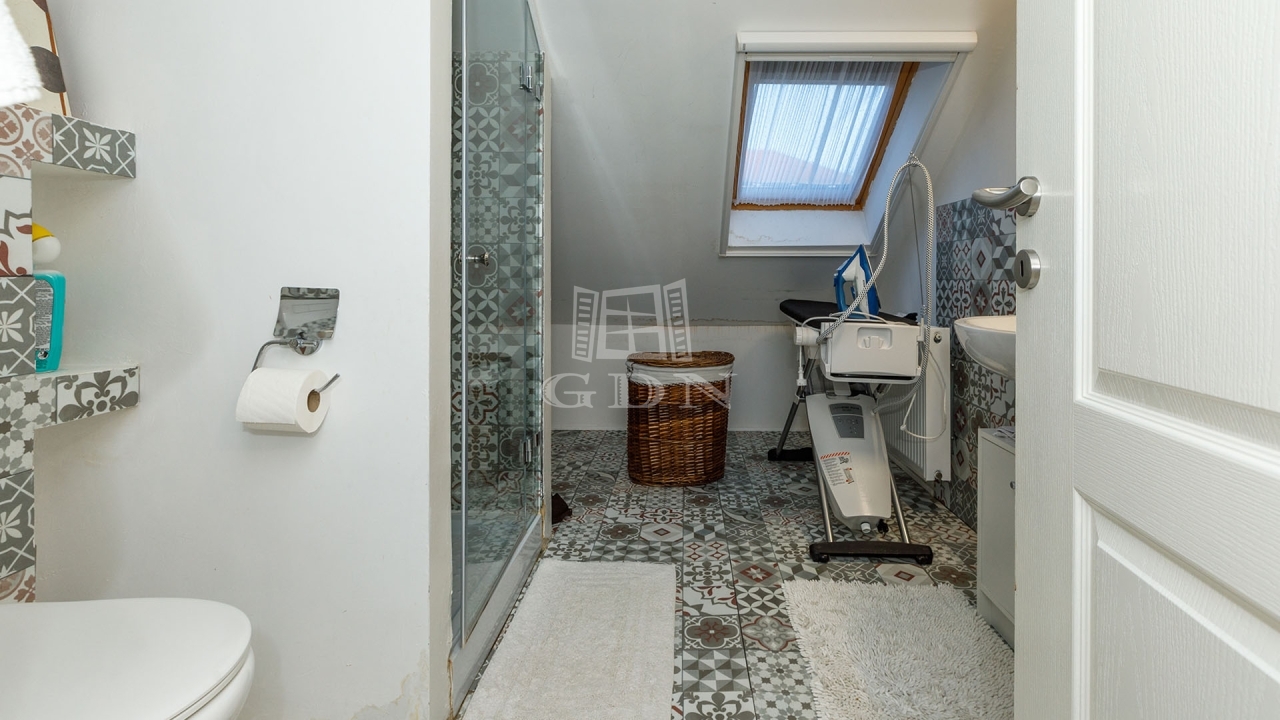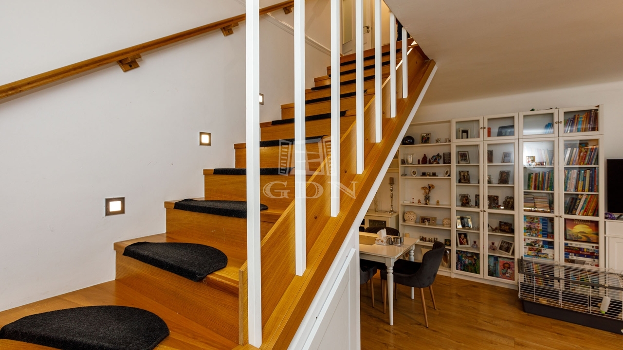 Ez a téglaépítésű ingatlan több szinten kínál tágas életteret, gondosan megtervezett belső terekkel. A földszinten egy szoba, konyha, tároló és fürdőszoba került kialakításra míg a többi három szinten további öt szoba, egy nappali egy konyha és két fürdőszoba áll rendelkezésre. A házhoz egy kertre néző erkély is tartozik az első szinten. Az autók elhelyezése garázsban és a ház előtt lehetséges.