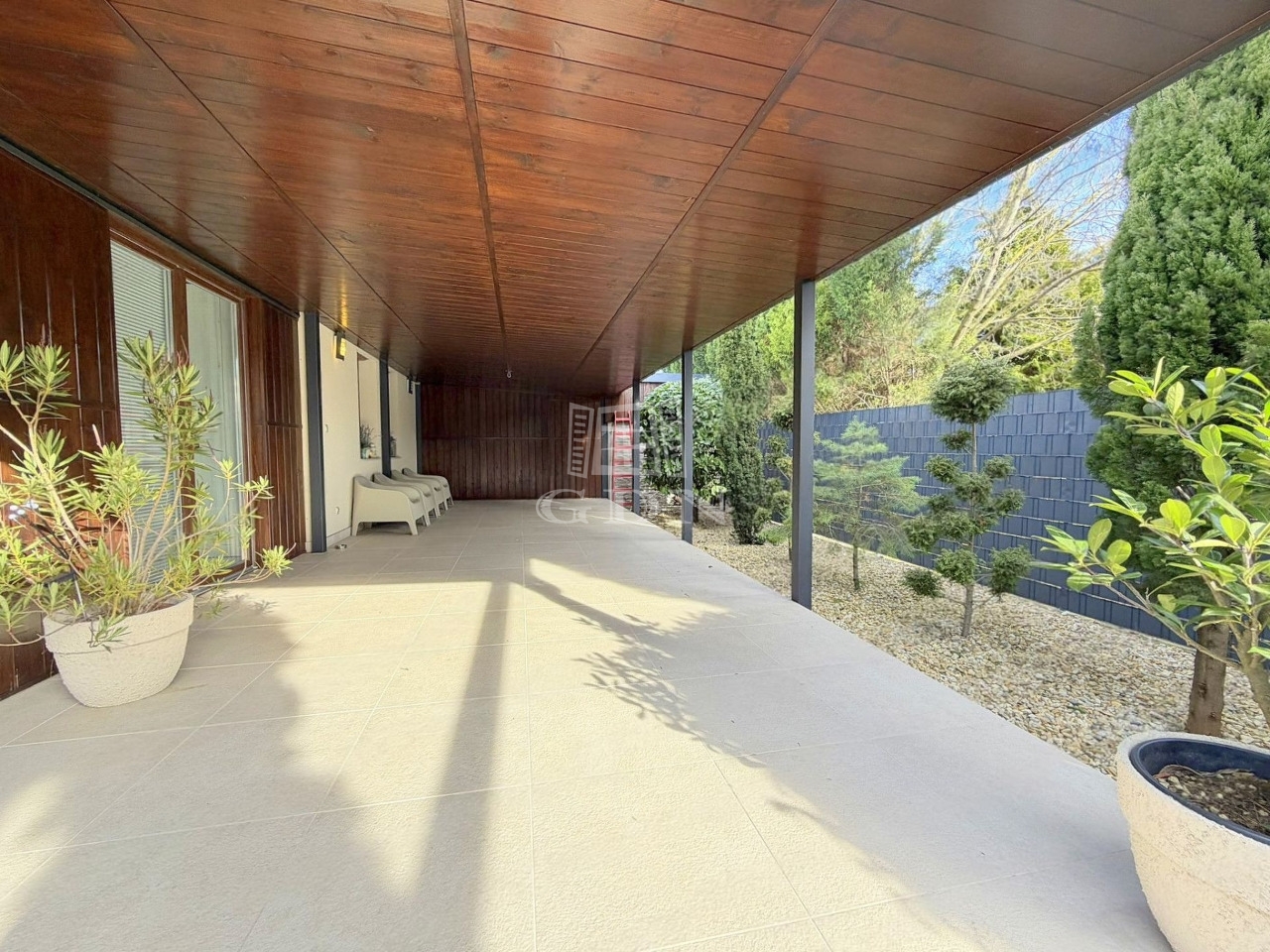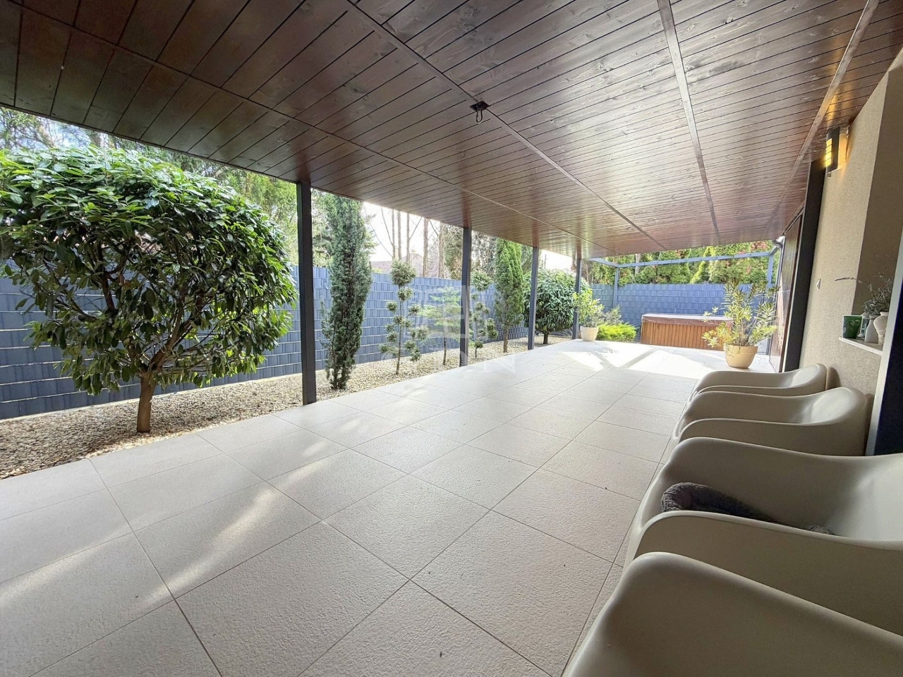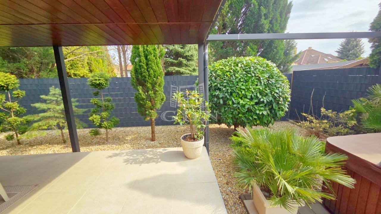 A kb. 550 m2-es telek tudatosan alacsony fenntartásúra lett kialakítva. Minőségi műfű, dekoratív kőfelületek és mediterrán növényzet biztosít kellemes hangulatot rendszeres gondozás nélkül. A privát szféra kiváló: sem az utcáról, sem a szomszédok felől nincs közvetlen belátás.