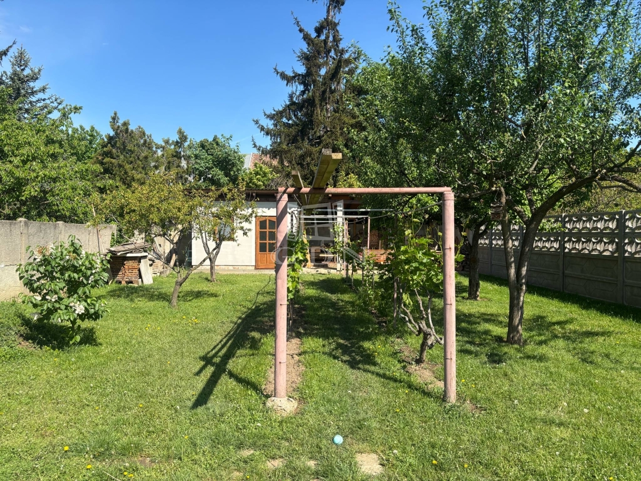 Az udvaron tárolók, gyümölcsfák és kút található.